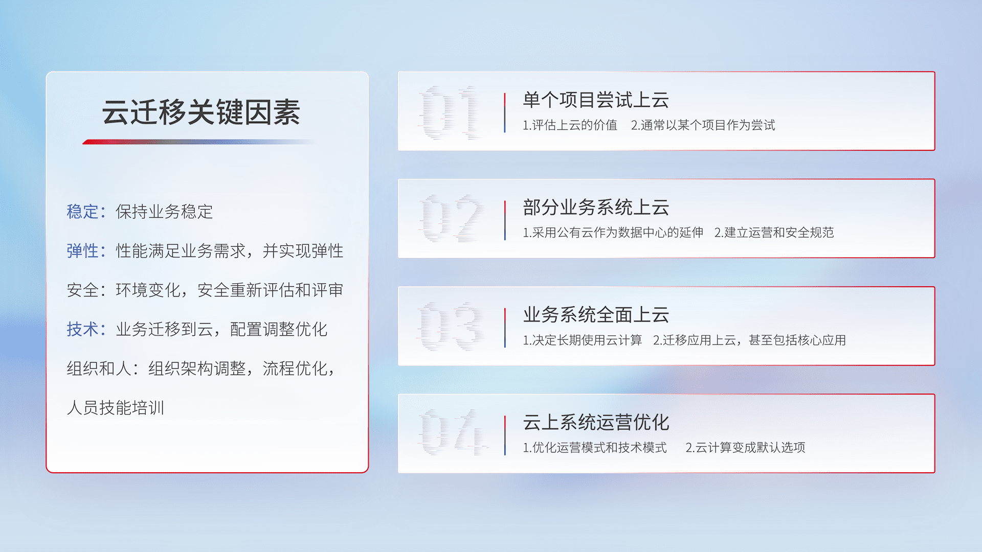 结合实际业务,,,,从规划设计、、云平台选型、、、、云原生改造、、数据迁移、、、、集成交付,,,迁移全过程为客户识别最佳上云路径,,,,做好风险识别管理,,,设计网络架构、、、身份权限、、、安全审计合规、、、操作审计、、、日志审计、、、监控告警策略、、、多站点容灾设计等,,,对云上基础设施进行整体规划,,,提升IT治理水平,,,以满足弹性、、、高可用、、、高性能的需求。。